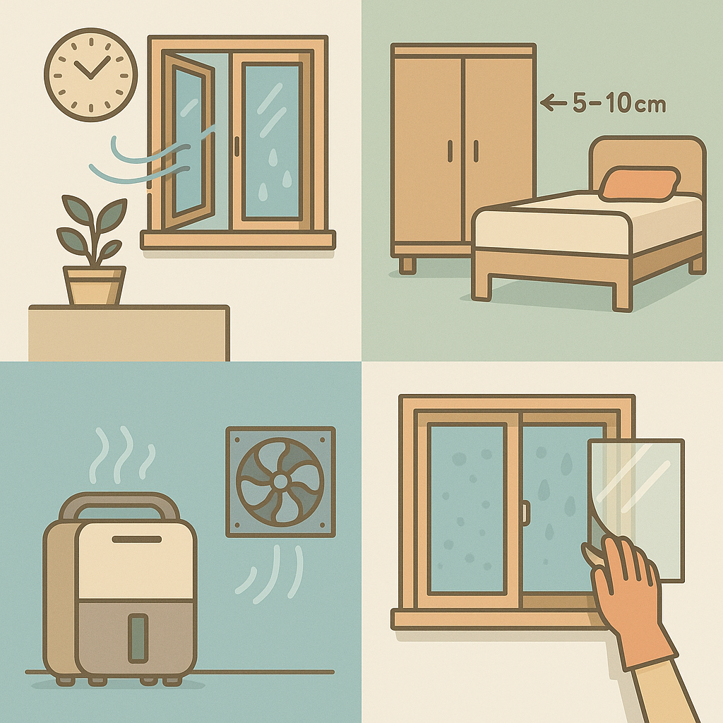 - 창문 주변, 베란다와 맞닿은 벽, 외벽 쪽처럼 결로가 자주 생기는 위치