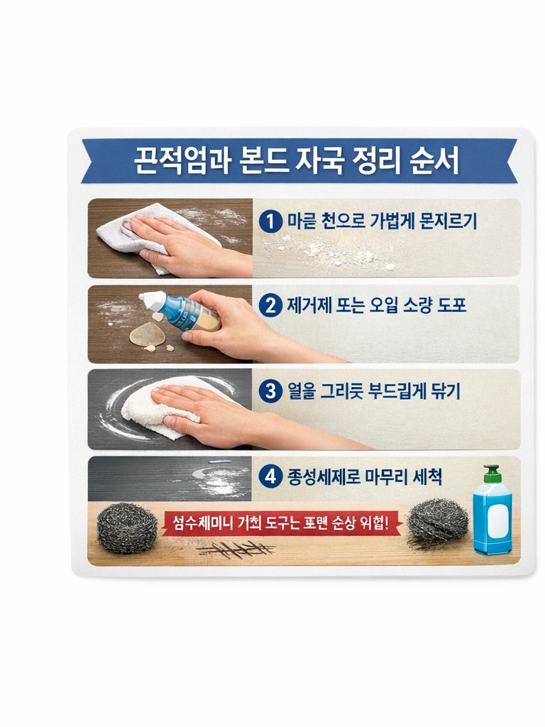 전용 제품이 없다면 식용유나 오일 성분도 임시 대안이 될 수 있으나, 흡수성 있는 표면에는 얼룩이 남을 수 있어 사전 테스트가 필수입니다. 벽지나 코팅이 약한 가구는 특히 주의하세요.