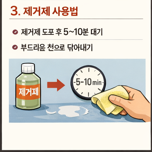 열만으로 해결되지 않을 때는 제거제를 병행하면 효과적입니다. 남아 있는 접착 자국 위에 소량을 도포한 뒤 5~10분 정도 기다렸다가 부드러운 천으로 닦아내면 됩니다.