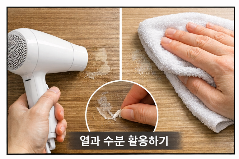 드라이기 바람을 약하게 쐬거나, 따뜻한 물에 적신 수건을 1~2분 올려두면 접착제가 부드러워집니다. 이후 마른 천이나 손톱으로 살살 밀어주면 대부분 무리 없이 떨어집니다.