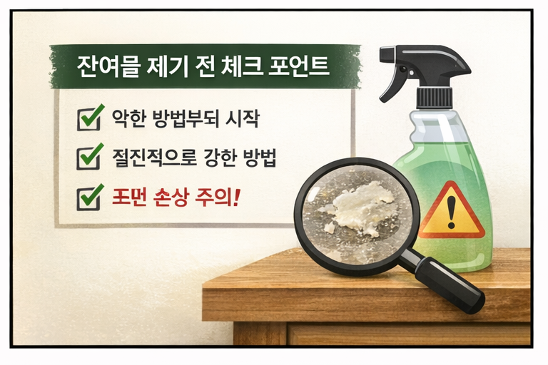 중요한 점은 처음부터 강한 화학제품을 쓰지 않는 것입니다. 접착 잔여물 제거는 약한 방법 → 점진적으로 강한 방법 순서로 진행해야 표면 손상을 피할 수 있습니다.
