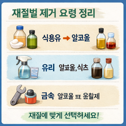 접착 잔여물 제거는 무작정 세게 문지르는 것이 아니라, 순서를 지키는 것이 가장 중요합니다. 집에 있는 재료만으로도 충분히 해결할 수 있으니, 표면 상태에 맞춰 하나씩 시도해 보시기 바랍니다.