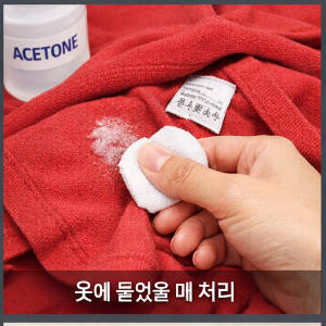 의류에 접착제가 묻었을 경우에는 반드시 세탁 라벨을 먼저 확인해야 합니다. 아세톤 사용이 가능한 소재라면 옷 안쪽에 테스트한 후, 화장솜으로 톡톡 두드리듯 처리해 주세요.