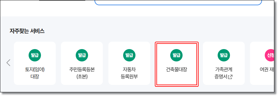 그 안에서 ‘건축물대장 등·초본 발급’이라고 써 있는 항목이 보여요.