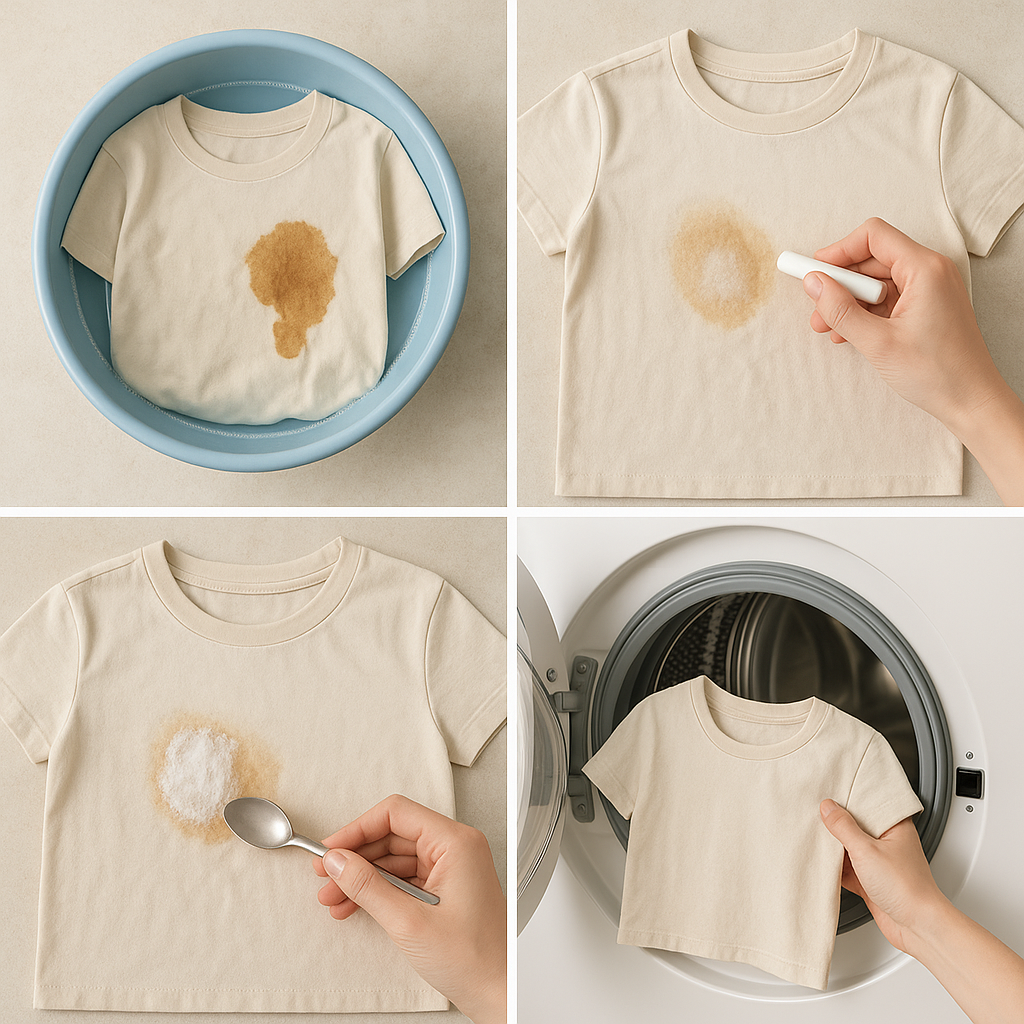 오래된 얼룩은 미지근한 물 + 세제로 불려주는 것이 효과적입니다.