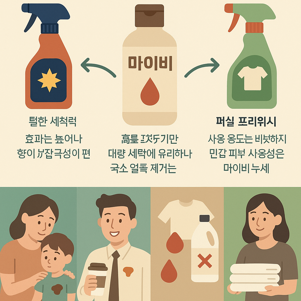 | 퍼실 프리워시 | 세탁 전 스프레이 | 사용 용도는 비슷하지만 민감 피부 사용성은 마이비가 우세 |