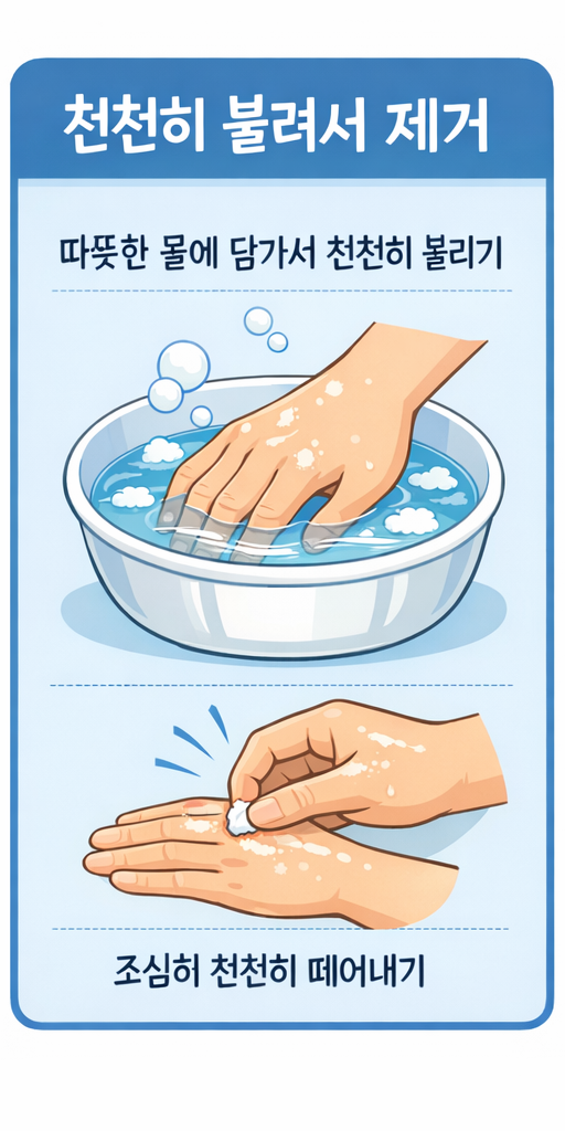 무심코 손을 비비거나 억지로 떼어내면 피부까지 함께 손상될 수 있어 주의가 필요합니다.